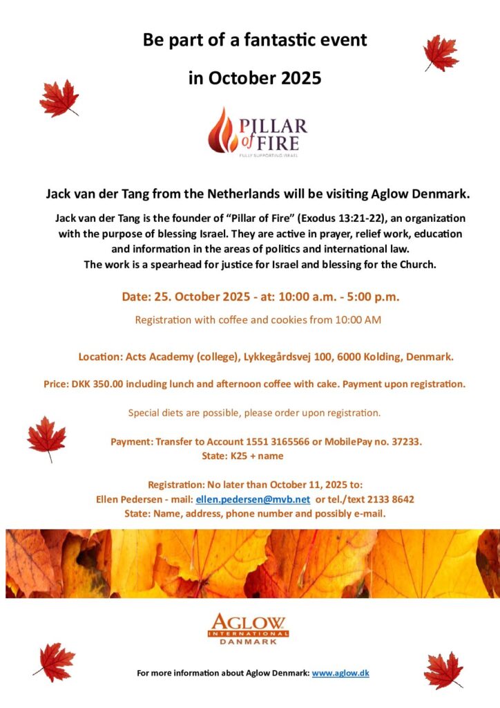 Jack van der Tang from the Netherlands will be visiting Aglow Denmark. Jack is the founder of “Pillar of Fire” (Exodus 13:21-22), an organization with the purpose of blessing Israel. They are active in prayer, relief work, education, and information in the areas of politics and international law. The work is a spearhead for justice for Israel and blessing for the Church.